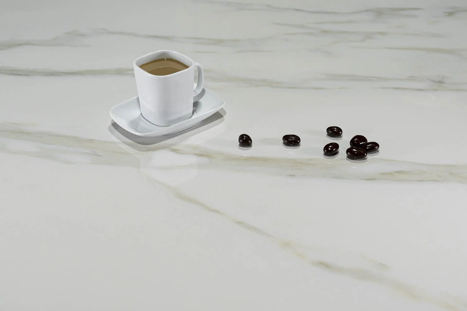 Reinterpretamos el conocido Calacatta Gold con un veteado de color amarillo-oro y plateado sobre la pieza blanca para generar ese contraste que se busca en los espacios más exclusivos y lujosos.