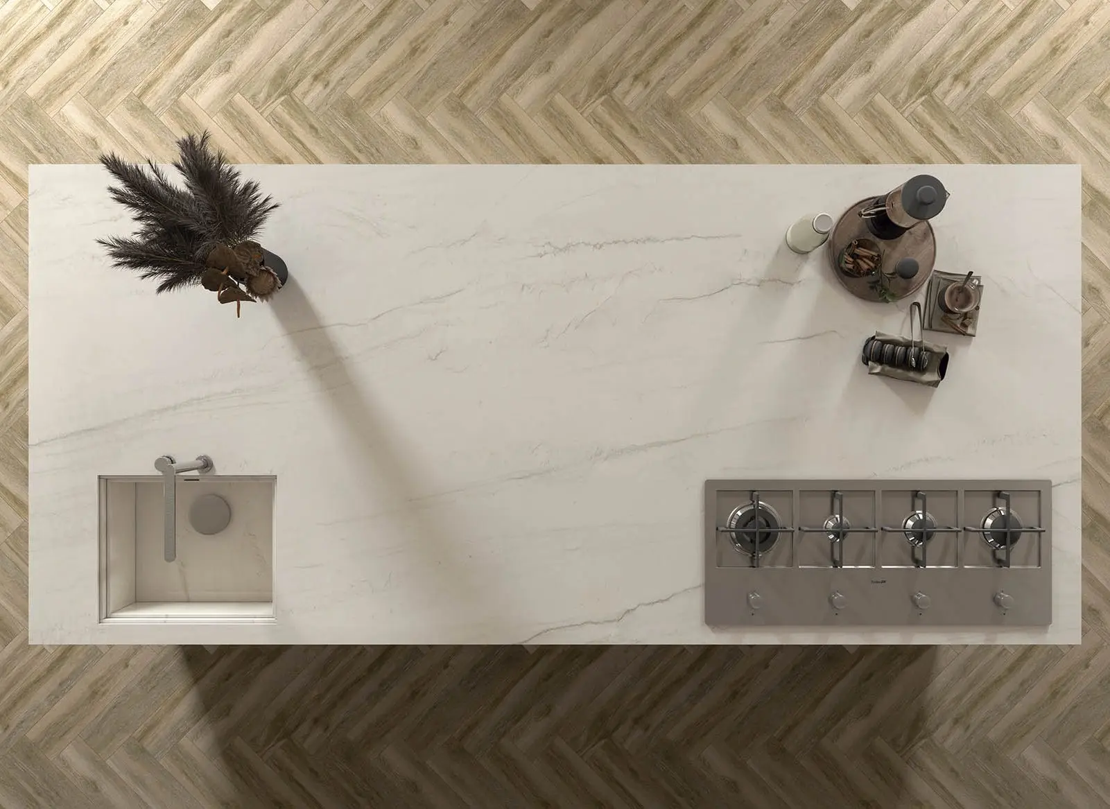 Montblanc está inspirado en una cuarcita brasileña blanco rota con vetas grises que ofrecen luminosidad y sofisticación a la cocina o el baño donde se instale.